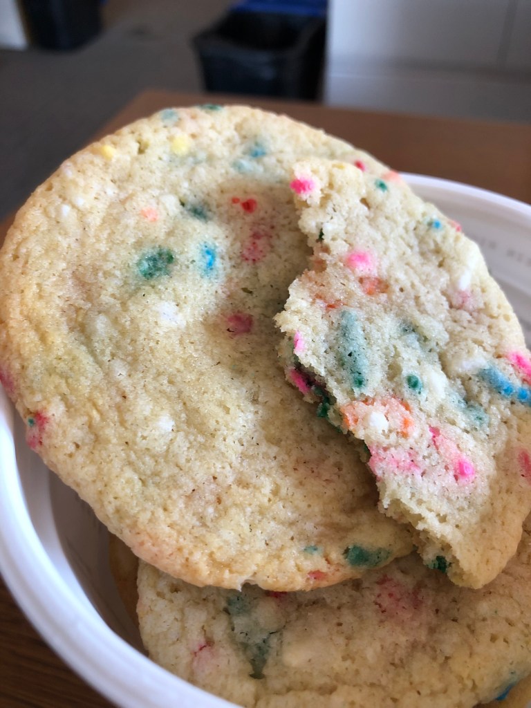 We don’t eat cookies because they will trim our waistlines or because they will increase our lifespans. We eat cookies for the same reason we write bad poetry. Because indulgence is a part of being human. Nothing says I’m a human being like Funfetti. That’s kind of awesome.
