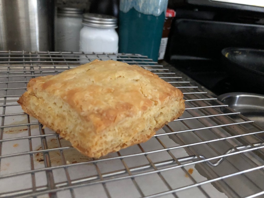 One more reminder, be sure to trim the edges of the biscuit slab before you cut it into nine pieces. Brian’s video mentions it, but the written recipe omits that step. It’s not the end of the world (if you’re a crispy-crunchy nibbles person, you might even prefer it that way), but making clean cuts on all the edges frees the layers to rise as high as they can. The craggy edges pinch and glue together otherwise, limiting the fullest height to the freer middle. Notice the difference between the front biscuit and the one behind it to the right.