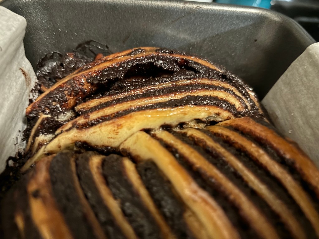 So we have a bit of a flat babka. And I didn’t cook the syrup for a super long time, either, so it was more watery than I was comfortable with and I left some off. I’m honestly sitting here holding my breath waiting for the other shoe to drop and the babka to fall along with it. I have such trust issues with this recipe. It always tastes great, of course, but I’m not here for taste alone. I want to nail the texture too.