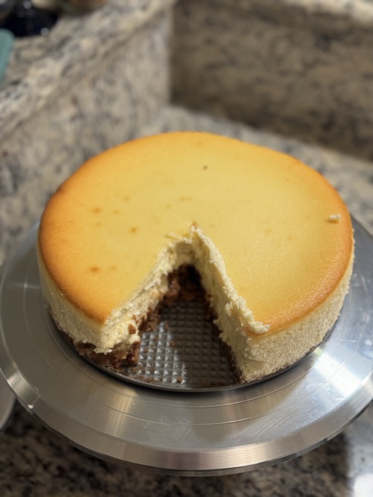 We get the cheesecake in the oven, then I have to run to the airport to grab my other friend. “How’s it looking?” I asked as I walked in the door, hoping to hear good news. “Well… it’s getting very brown on top, but it’s not set?” “Let me see!”