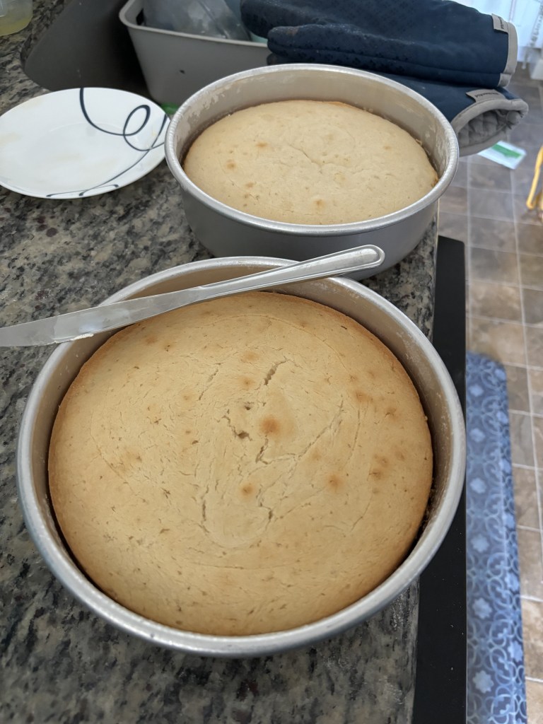 So the white velvet cake I tried making wasn’t all that special. If you need a white cake, the Two Chicks from the Sticks Grandma’s Almond Snow Cake still, well… takes the cake (Sorry for that). This one was pulling away from the sides while it was still raw on the inside — I had to keep baking it!