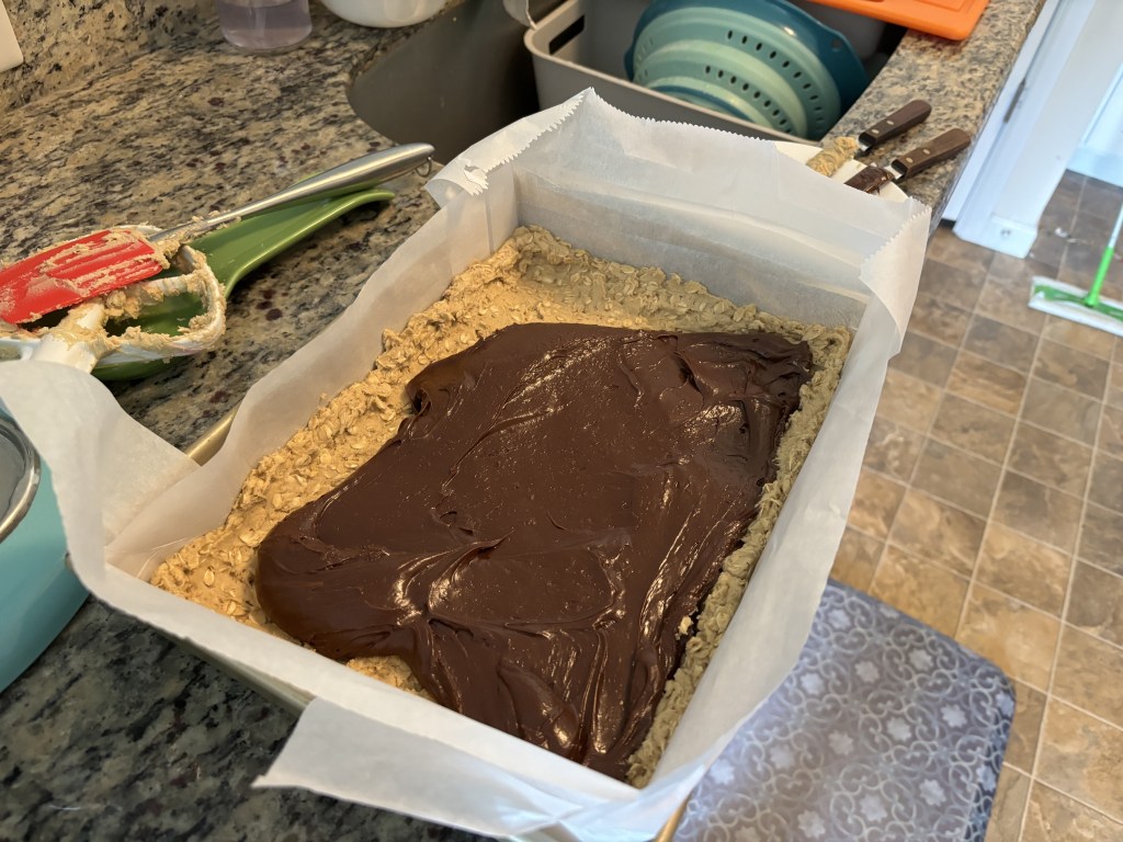 But I still needed something good. Something tested. And I wanted something that I personally loved, so that I’d feel proud of it. My bestie suggested that people love chocolate. And I love oats. So here we are. This is the Two Chicks from the Sticks recipe for Chocolate Oat Bars, and boy do they deliver. I’ll also be getting a workout bringing these into the office, because they weigh no less than seven pounds, I swear. It’s an oatmeal cookie crust and topping (same dough, brilliant!) with an inch of easy homemade fudge sandwiched between. And I do mean easy, it was 2.5 minutes in the microwave at half power, I’m not scaling up the word “easy” because I’m experienced or anything.