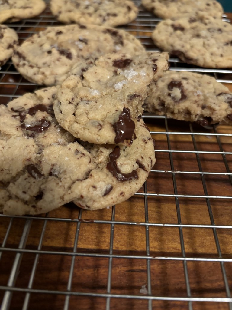 Browning the butter is very important. There’s no reason, in a quick chocolate chip cookie, to use melted butter and not browned. I’ve seen it done, and it’s always a mistake. You’re already there — take it all the way. You need the flavour base. I use around 6 ounces of chocolate instead of 8, because at 8 I feel like you start to have more of a mass of chocolate loosely stitched together with dough and less of a cookie. These seemed really white to me when I was baking them, but it was at time and I didn’t want to over bake them (please don’t), so I pulled them. They were normal and fine; I think the white was just from context. Usually when I make CCCs they’ve been rested, and when they’ve rested they’re always darker.