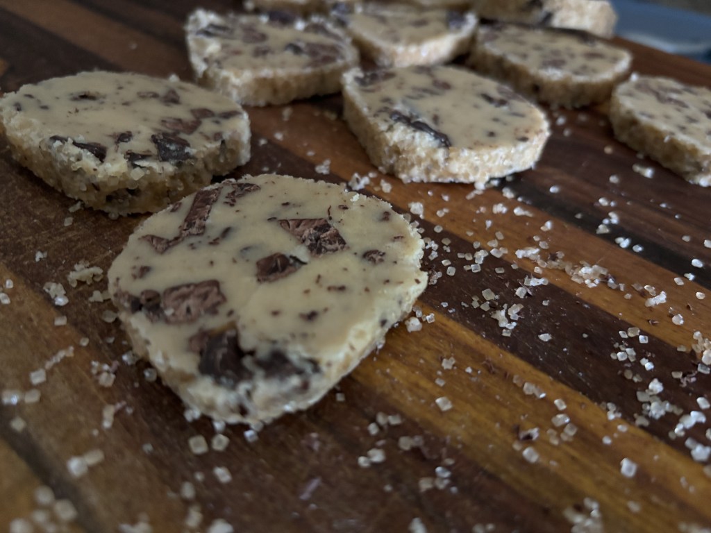 Two thoughts came to mind, one of which was an inside thought and the other which I expressed out loud. They’re not even that round, my dude, and “Oh, no, not at all! They’re log cookies! I rolled them in a log and then sliced them!”