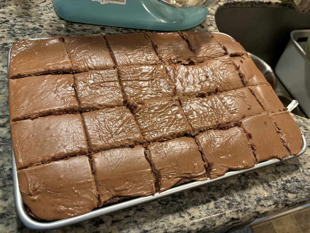 You may know it as Irma’s Brownies, but it is not a brownie. I also have never heard one person refer to it as “Farm Girl’s Sheet Cake,” which is how Jill Schwalbe Means and Jamie Greenland Gorey title it in their wonder of a recipe book. This will always be, to me, Texas Sheet Cake.