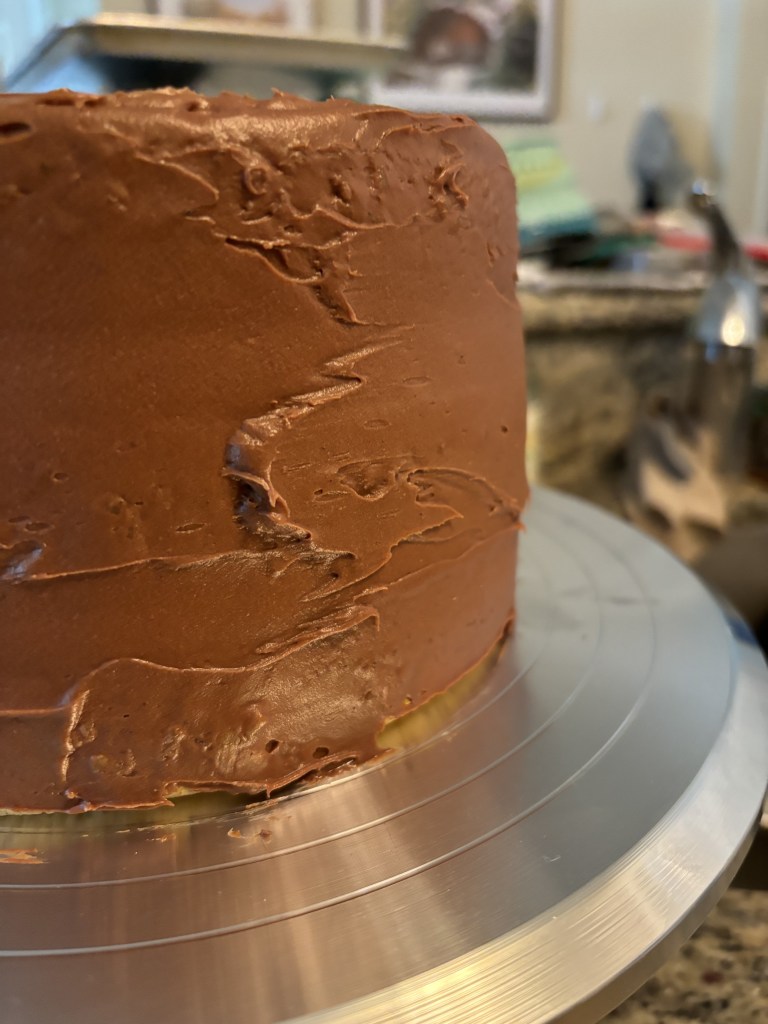 This white cake is Grandma’s Snow Almond Cake from Two Chicks from the Sticks, and is the white cake I swear by. I topped it with chocolate frosting from my freezer. No idea what recipe that was. Pulling frostings out of my freezer sometimes makes me feel like the guy from the Progressive commercial, the series about people turning into their parents. “What’s this?” the therapist/trainer asks a homeowner who’s turned into his father, as he holds up a bag of mysterious spheres pulled from the deep freeze. “… Meatballs?” the fanny-packed homeowner replies. “Scotch eggs!”