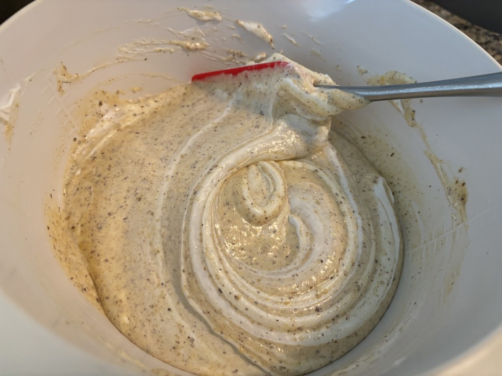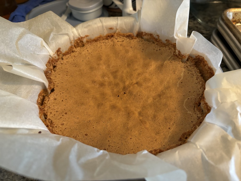 So it rises to unmaintainable heights in the oven, then even in there starts to droop. By the time I’m poking it with the cake tester, it’s approaching its final form. How the mighty fall. Except it isn’t a problem, because it’s just doing what it’s supposed to do. What I knew all along was going to happen. It’s only acting according to its nature. Sure, I might have been thrown if I hadn’t known. A new baker might be in a panic. I’m not.
