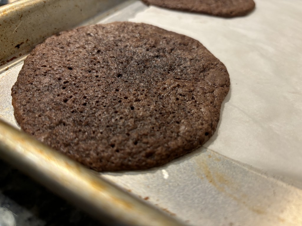 This cookie, Sarah’s Thin and Crispy Double Chocolate Chip Cookie, manages to perfectly mimic the taste and texture of that bagged Costco snack food called Brownie Brittle. Which is what I’m now calling the recipe. It shatters when you bite into it; crumbs go flying everywhere. It’s flatter than a boxed-mix pancake and wonderfully aerated with hundreds of itty-bitty bubble holes, frozen in time as the cookies harden after baking.